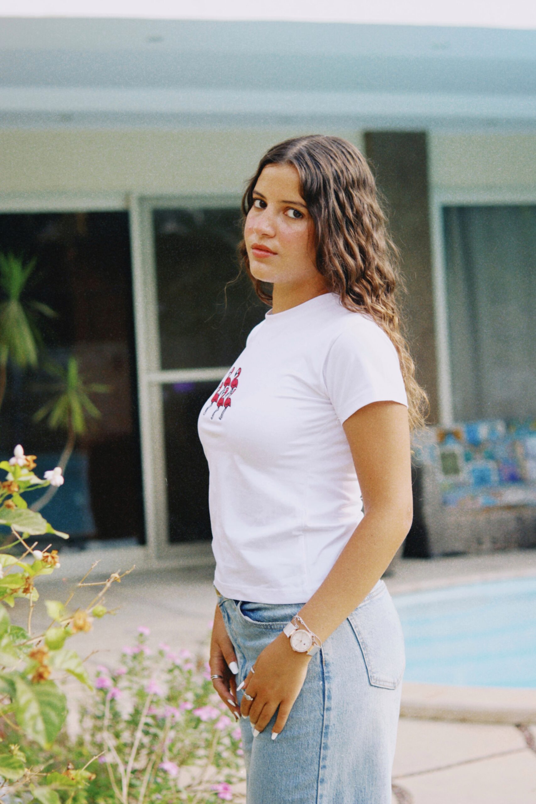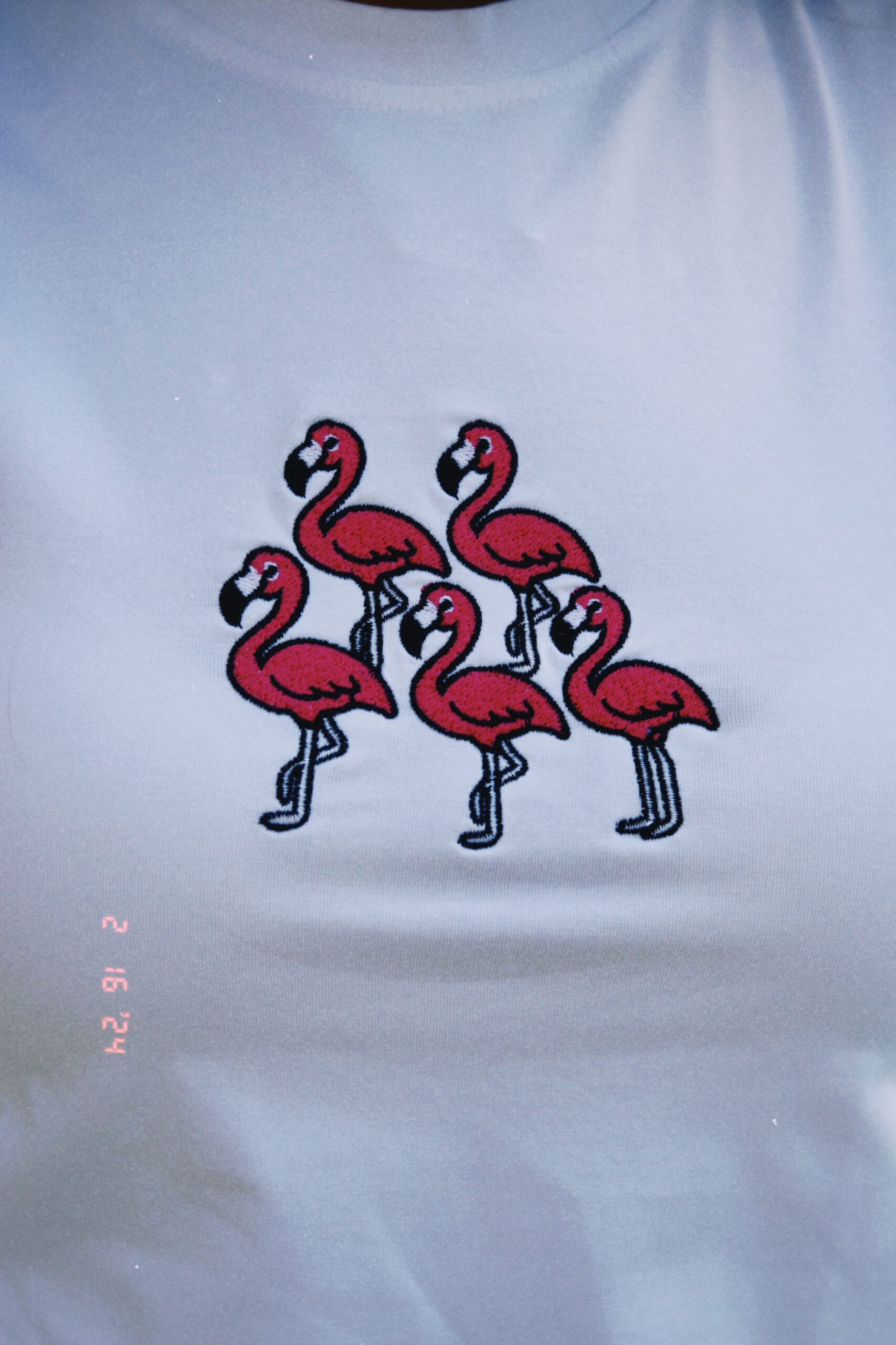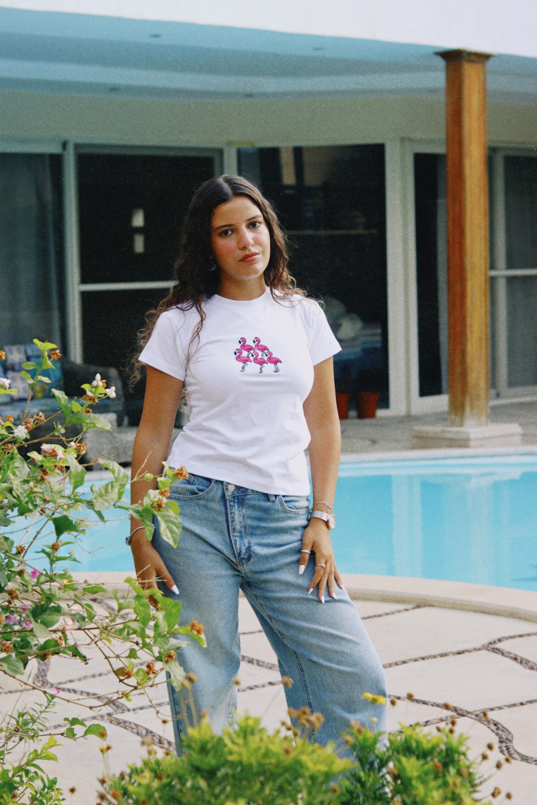 The Flamingle Baby Tee is fresh, light, and effortlessly playful. In classic white, it features a stitched flamingos design at the center — adding a fun pop of personality to this everyday essential.