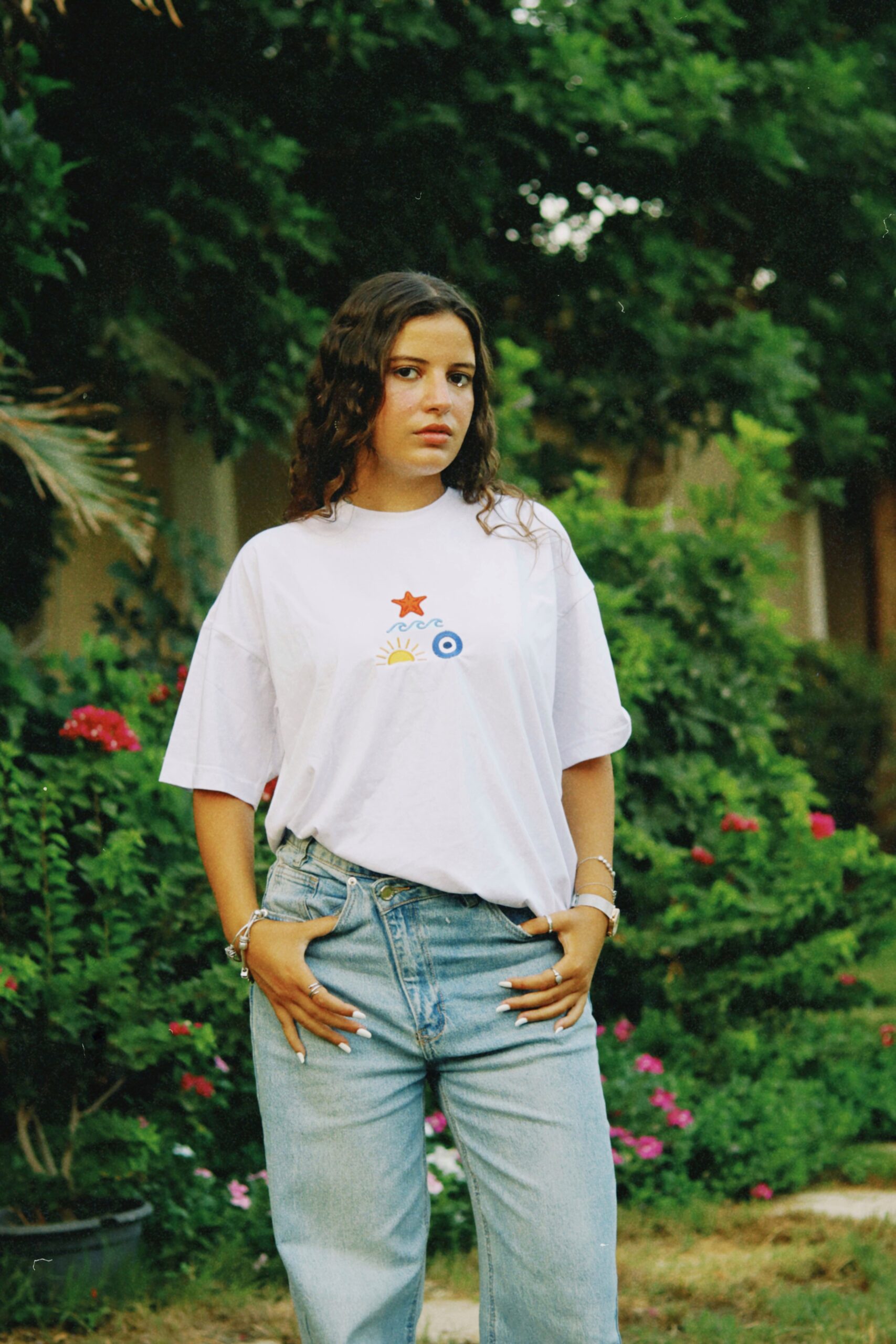 The Sea Spirit Oversized Tee captures the calm and energy of the ocean. On a clean white base, it features a stitched design at the center with a starfish, wave, sun, and evil eye — a mix of playful and protective symbols inspired by the sea.