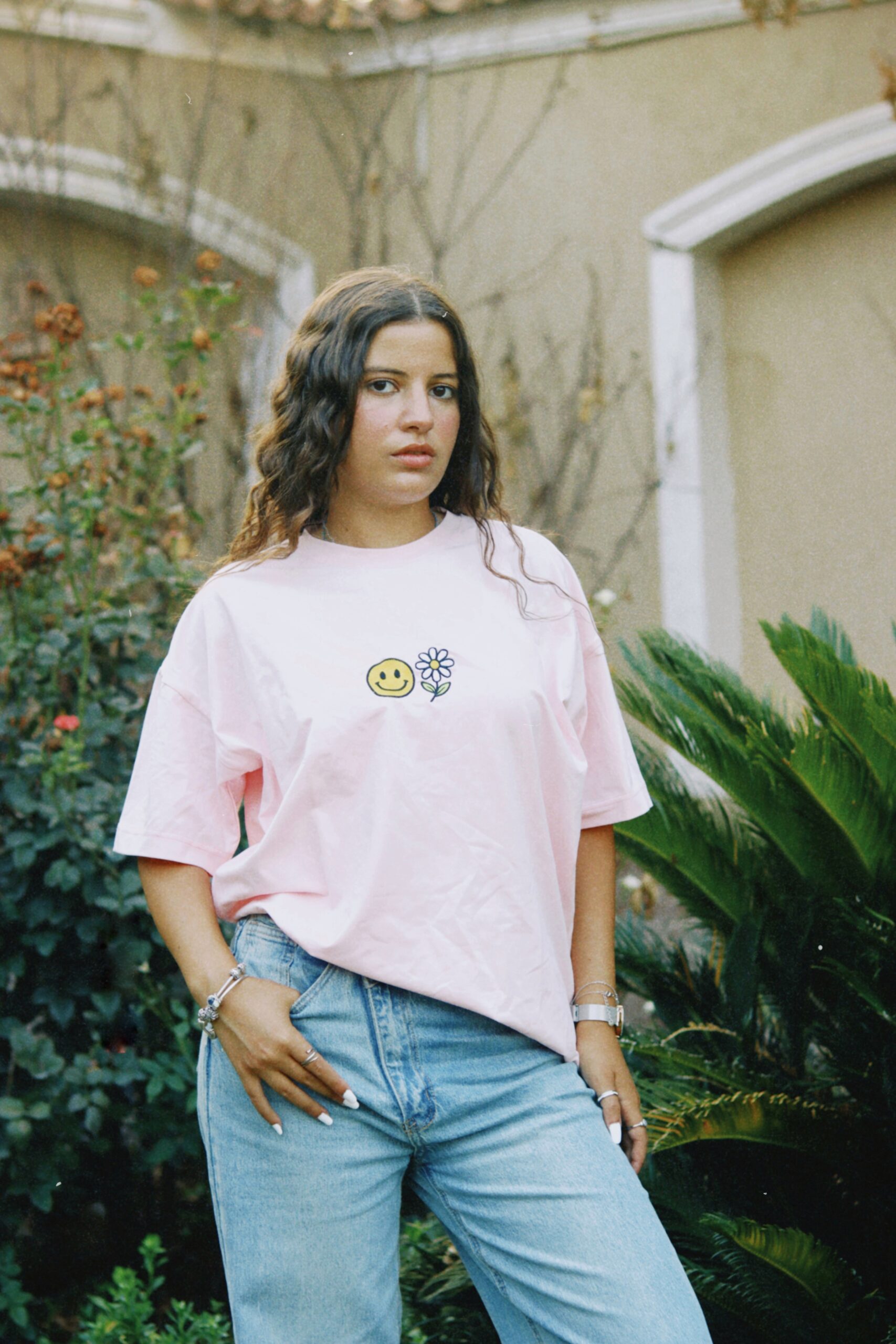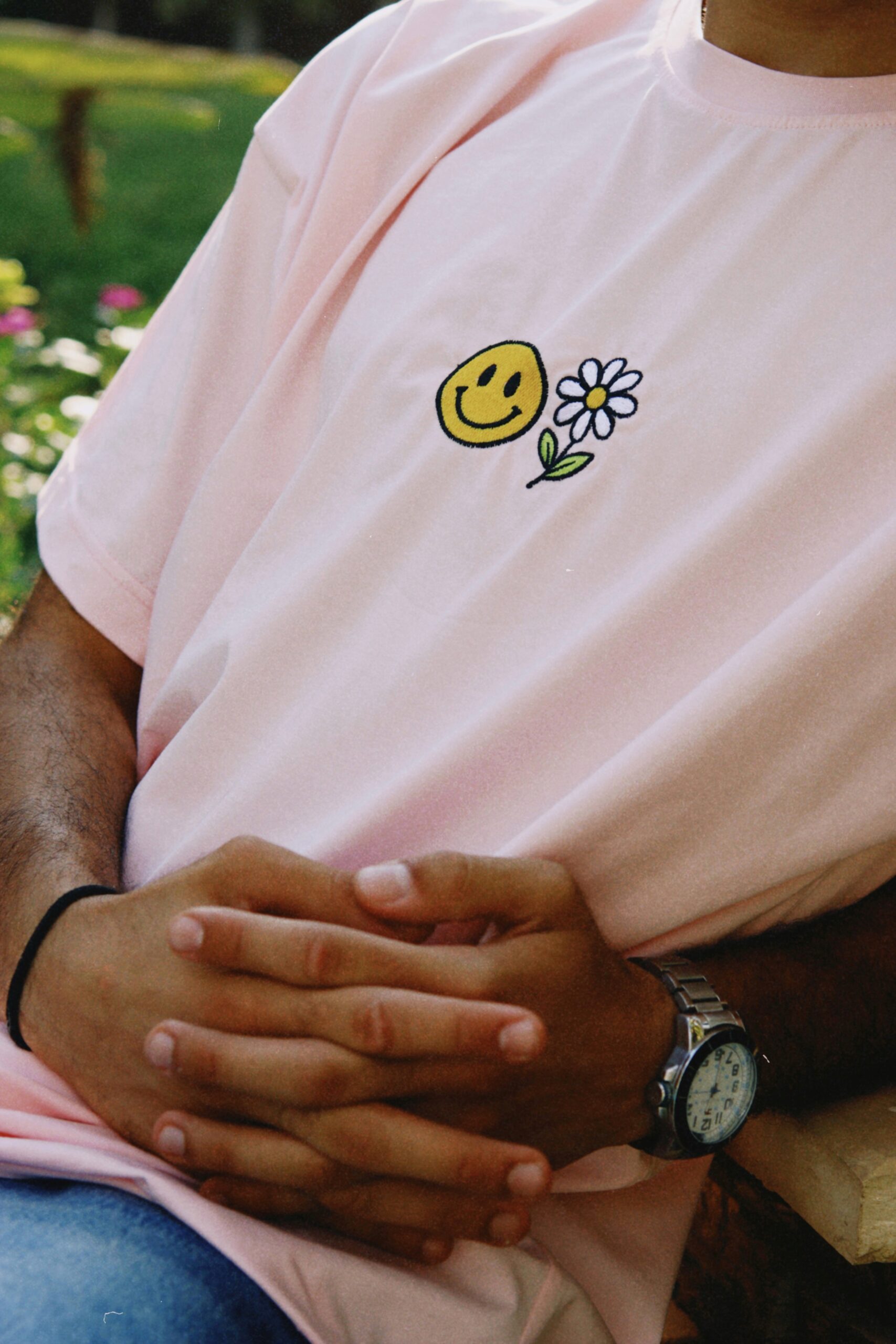 The Smiley Blossom Oversized Tee is all about good vibes and playful energy. In a soft pink shade, it features a stitched design at the center — a small white flower with a bright yellow smiley face — simple, cheerful, and instantly uplifting.